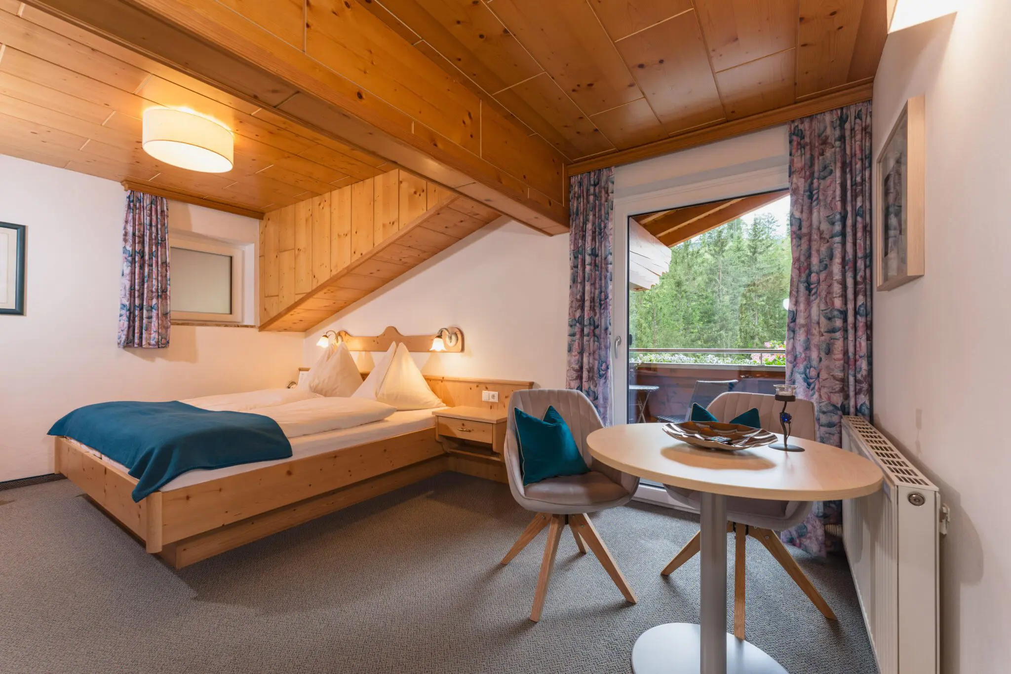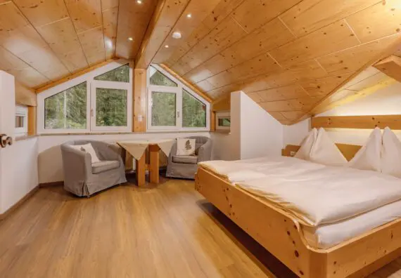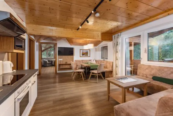- living & dining room in alpine style with spruce wood furnishings