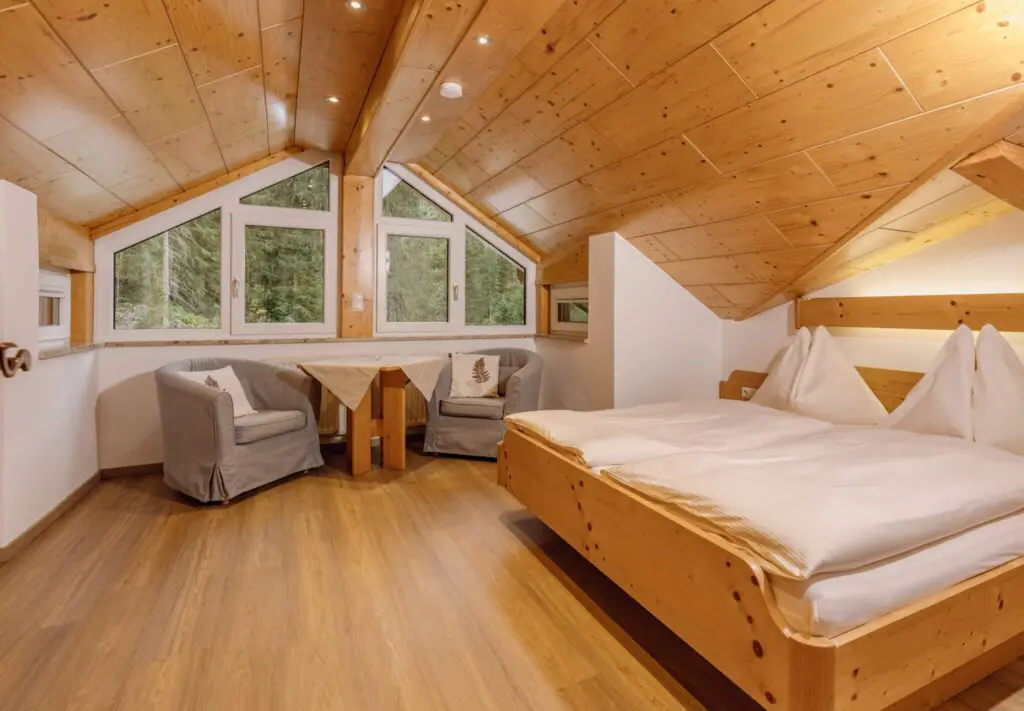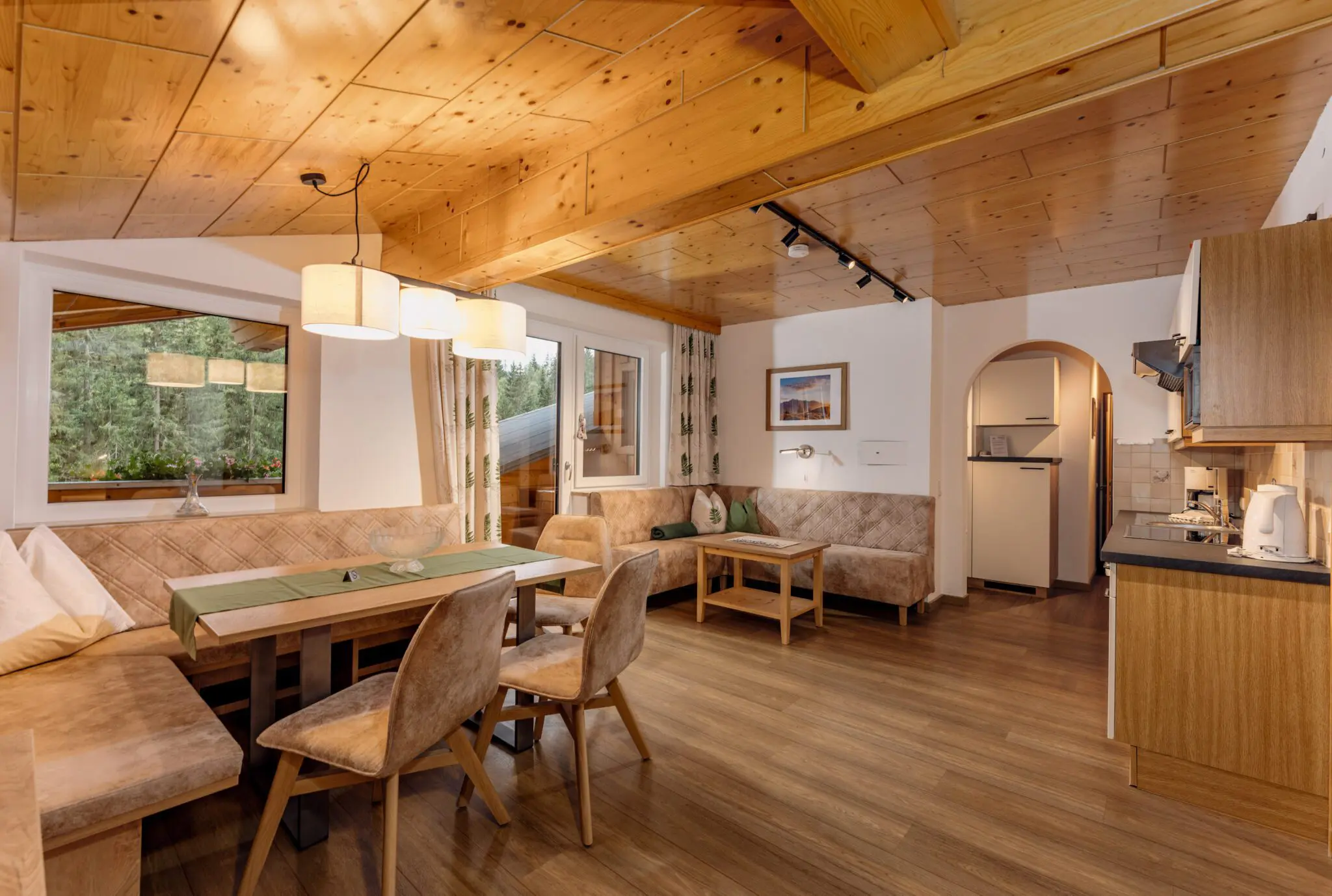 - living & dining room in alpine style with spruce wood furnishing
